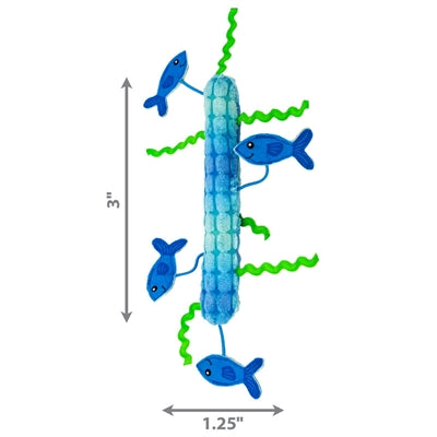 Kong Kickeroo Stickeroo med skrynkljud och kattmynta blå 26x11x2 cm är en kattleksak med kattmynta- och skrynkljud i en avlång form. Kickeroo Stickeroo från Kong är drömleksaken för varje katt. Skrynkljudet lockar kattens uppmärksamhet och den avlånga formen inbjuder katten att brottas med leksaken med hela kroppen. Fisken och sjögräset sticker ut och väcker kattens fångstinkt. Kattmyntan i leksaken ger det roliga en extra boost!