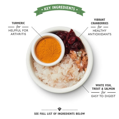 Sammansättning : 70 % färska ingredienser: säsongens sik (35 %), kalkon (29 %), öring (6 %). Potatis, potatisprotein, cellulosa, fisksås, ägg, linfrö, extrakt av grönläppad mussla (0,2 %), gurkmeja.