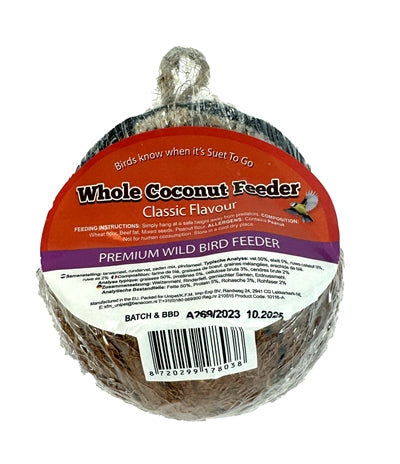 Suet To Go Whole Coconut är ett utsökt vinterfoder för trädgårdsfåglar, rikt på fett för extra energi i ett naturligt kokosnötskal. Fåglar i trädgården eller på balkongen kan behöva lite extra godbitar i vinter, och de kommer gärna till din trädgård eller balkong för denna roliga kokosnöt. Kokosnöten är naturlig och fylld med fett, vilket ger fåglarna välbehövlig extra energi. Du kan enkelt hänga kokosnöten i repet.
