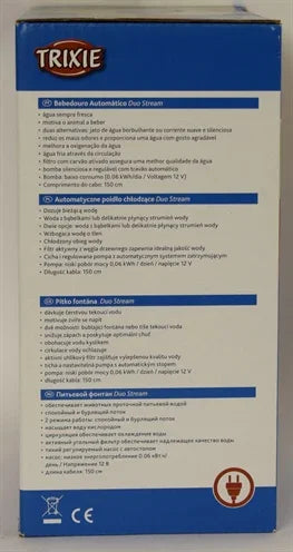 Trixie Duo Stream dricksfontän ger en konstant tillförsel av färskt, syrerikt vatten till din hund eller katt. Tack vare de två inställningarna kan du välja mellan en bubblande stråle eller en mild spray, beroende på ditt husdjurs preferenser. Vattencirkulationen bidrar till naturlig kylning och uppmuntrar husdjur att dricka mer. Det aktiva kolfiltret förbättrar vattenkvaliteten genom att minska smaker och föroreningar. Pumpen har en autostoppfunktion för extra bekvämlighet. Dricksfontänen är tillverkad av plast och är energieffektiv. Reservfilter finns tillgängliga separat.