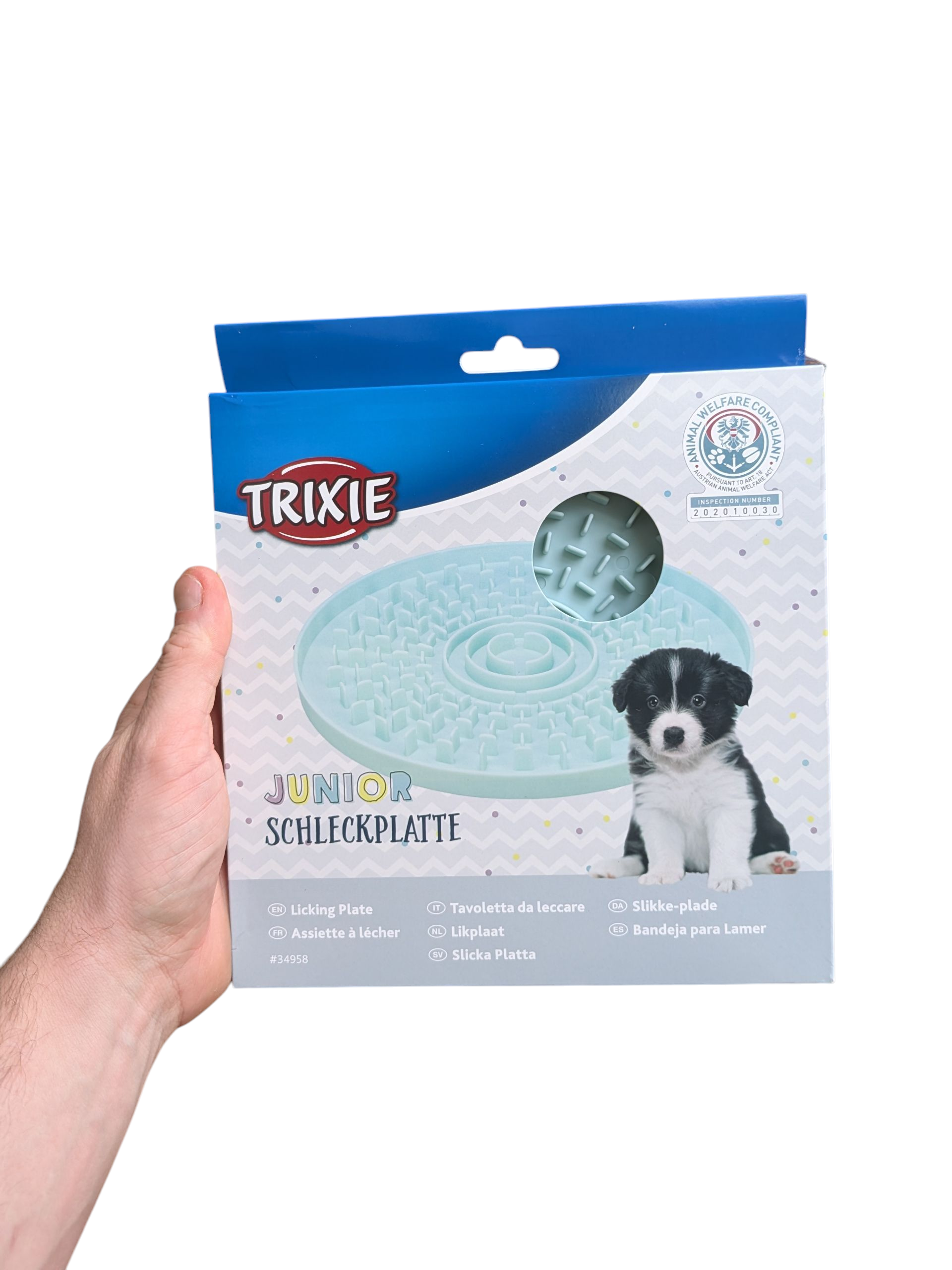 Trixie Junior Lickmatten är ett smart och lugnande sätt att sysselsätta din valp eller lilla hund. Denna runda slickmatta är perfekt för att servera paté eller våtfoder, så att din hund kan njuta av sin godbit på ett lugnande och långsamt sätt. Slikkande hjälper till att minska stress och förhindrar trötthet. För extra avkylning på varma dagar kan du frysa in lickmatten med en god snack, så att din valp kan njuta av den ännu längre.