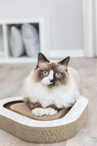 Trixie klösträd i kartong med 2 bollar, 36 x 36 x 5 cm, är ett unikt klösträd med två bollar inuti för extra dragningskraft och skoj. På så sätt är det mer troligt att din katt klöser på klösträdet än på dina möbler! Klösträdet är triangulärt och har ett roligt tryck på ovansidan. Själva klösträdet är tillverkat av kartong berikat med kattmynta. Inuti klösträdet finns en bana med två bollar, som din katt kan leka med genom att knacka dem fram och tillbaka genom formen. På så sätt kombinerar Trixie klösandet med leken, så att din katt inte blir uttråkad!