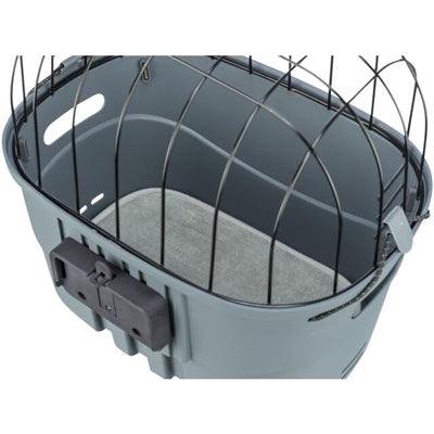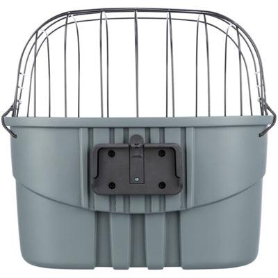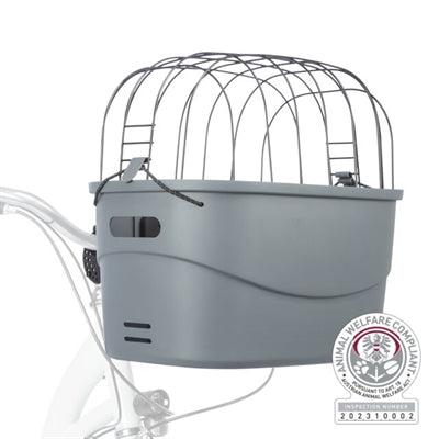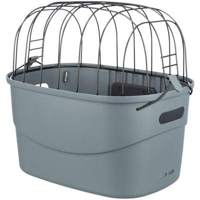 Cykelkorgen består av en slitstark plastbehållare med en robust metallnätöverdel. Detta håller din hund säkert på plats, samtidigt som den kan se och njuta av naturen. Inuti förhindrar en halkfri matta att din hund halkar under cyklingen. Det finns också en fästpunkt för ett kort koppel eller hundkoppel, så att du säkert kan spänna fast din hund.