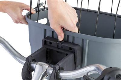 Cykelkorgen är lätt att ta bort tack vare snabbkopplingsmekanismen. Detta gör att du snabbt kan ta in korgen eller helt enkelt klicka av den när du parkerar cykeln. Korgen är lämplig för montering på styret med ett universellt styrfäste (ingår ej).
